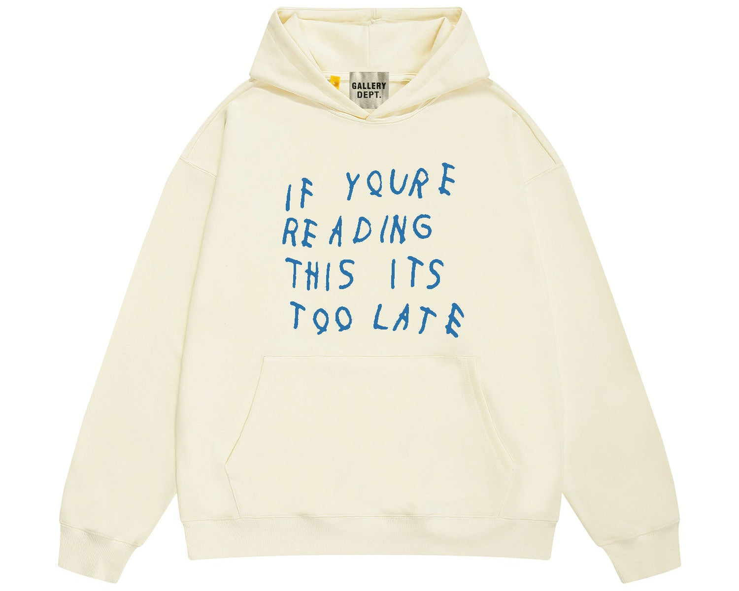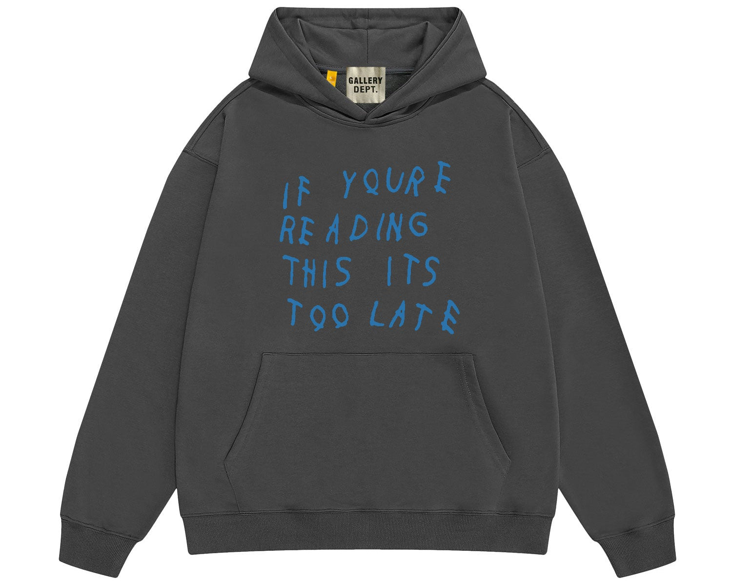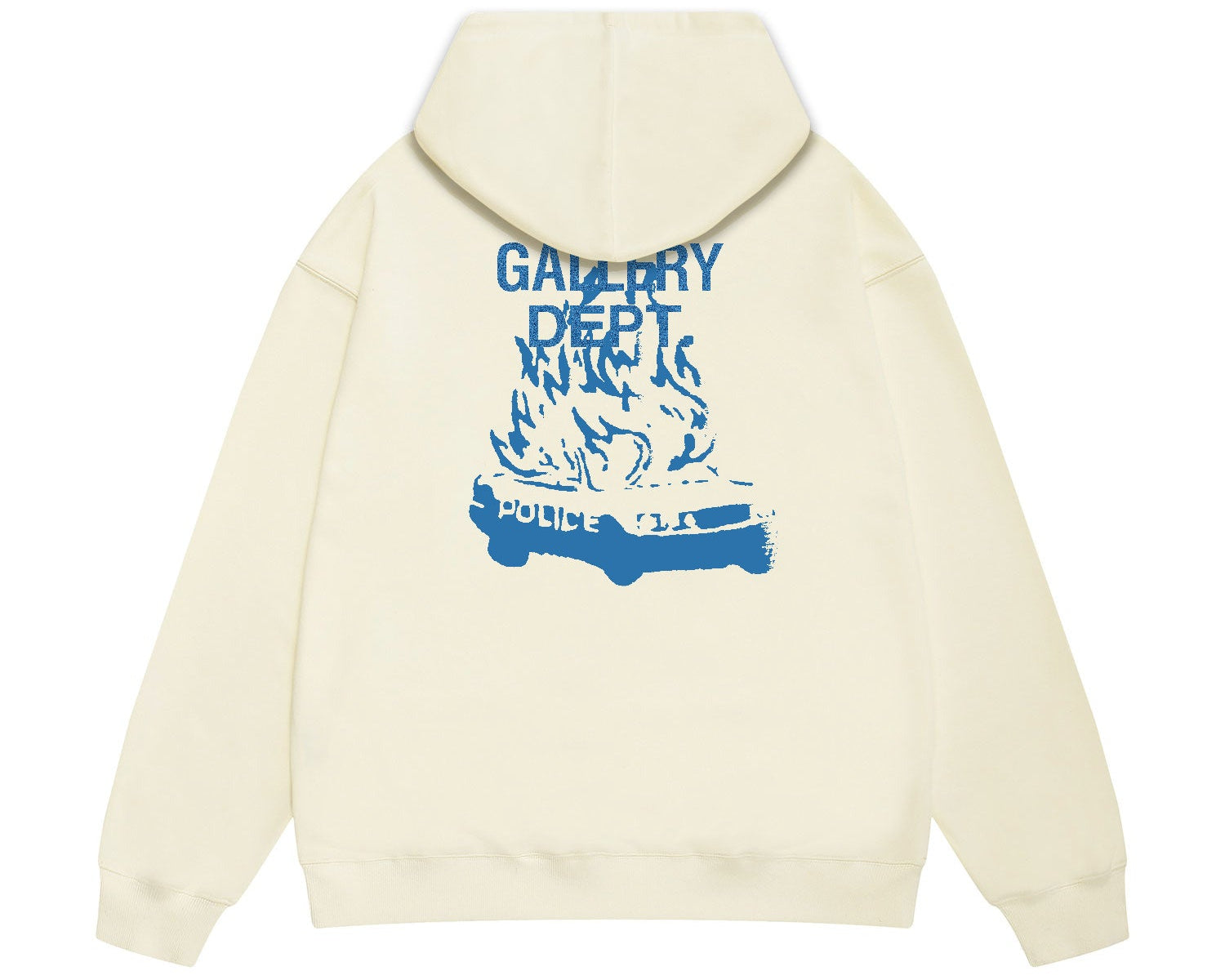הדגם הנועז של Gallery Dept מגיע בהדפס ייחודי המשלב אמירה אמנותית חדה עם עיצוב רחוב עדכני. החזית נושאת כיתוב ידני בסגנון גרפיטי – "IF YOU’RE READING THIS IT’S TOO LATE" – בגוון כחול בולט על רקע כהה, והגב מציג גרפיקה דרמטית של רכב משטרה בוער עם הלוגו האייקוני של Gallery Dept. שילוב זה הופך את הפריט לאייקון אופנתי עם הצהרה חזקה.